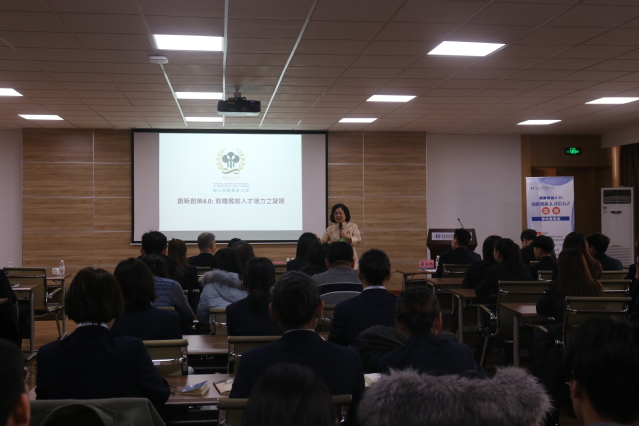 会谈后,林玥秀校长在办公楼四楼会议室为我院师生进行了题为“创新创业4.0:前瞻餐旅人才培力之凝视”的学术报告会。她详细讲解了高校餐饮人才培养的目标,并指出餐饮人才应该具备会说故事、会经营管理、会沟通、有温度等特质。林玥秀还介绍了台湾高雄餐旅大学餐饮人才培养的八大核心能力,包括职场就业、服务关怀、应用创新、国际视野、敬业合作、团队合作、经营管理、沟通表达等。报告会期间,林玥秀与到场师生们互动频繁,现场气氛热烈。姜玉鹏主持报告会,并结合学院刚刚结束的说课大赛对林校长的精彩报告进行了充分肯定,他希望现场师生们能够充分吸收此次报告的精髓,在日常教学与学习中灵活运用。报告会期间,林玥秀校长还与我院下学期即将赴高雄餐旅大学交换学习的5名交换生进行了亲切会谈。