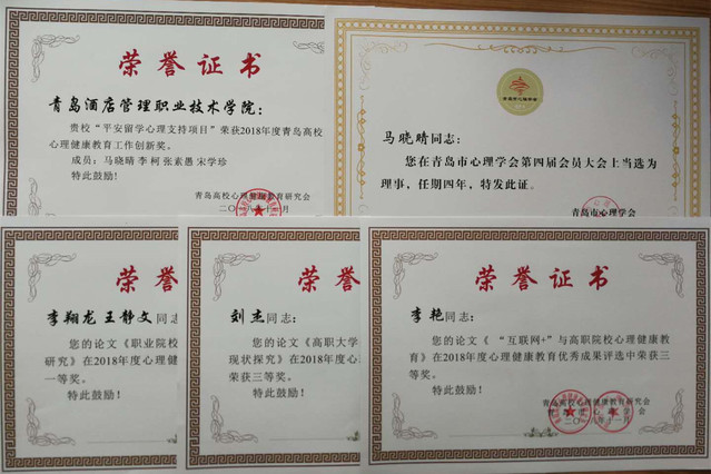 会上,与会人员听取了青岛市心理学会2018年工作报告,对2018年度青岛高校心理健康教育研究优秀成果和工作创新项目予以表彰,我院“平安留学心理支持项目”荣获2018年度青岛高校心理健康教育工作创新奖,李翔龙论文《职业院校学生抑郁情绪及其特点调查研究》荣获2018年度心理健康教育优秀成果一等奖,李艳论文《“互联网+”与高职院校心理健康教育》、刘杰论文《高职大学生“手机依赖症”心理疾病现状探究》分别荣获三等奖。
