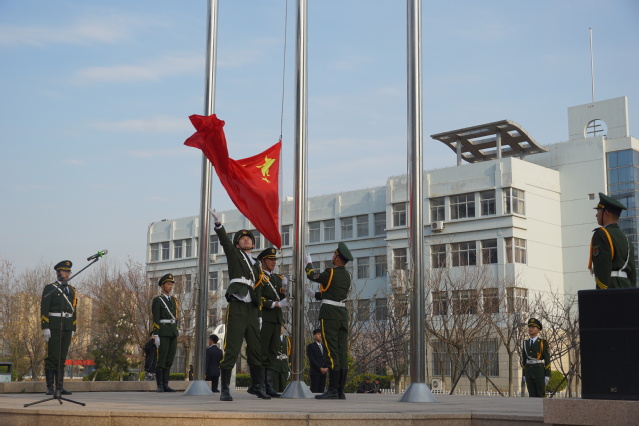 7点30分,国旗护卫队的旗手们着装整齐,迈着矫健的步伐,护着鲜艳的五星红旗入场举行升旗仪式。伴着《义勇军进行曲》的响起,全体人员唱国歌、行注目礼,庄严肃穆。