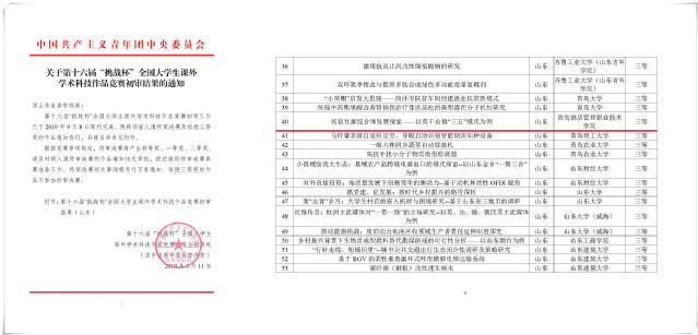 此前,该作品在5月28日-30日举行的第十六届“挑战杯”全国大学生课外学术科技作品竞赛山东省赛终审决赛中,从山东大学、中国石油大学(华东)、哈尔滨工业大学(威海)等高校的162件优秀作品和40件复活赛作品脱颖而出,入选国赛。本次国赛中,山东省入围作品69项,26项入围终审决赛,43项作品获三等奖,作为省内两所高职院校之一、我院唯一的入围作品被大赛组委会评为国家级三等奖。