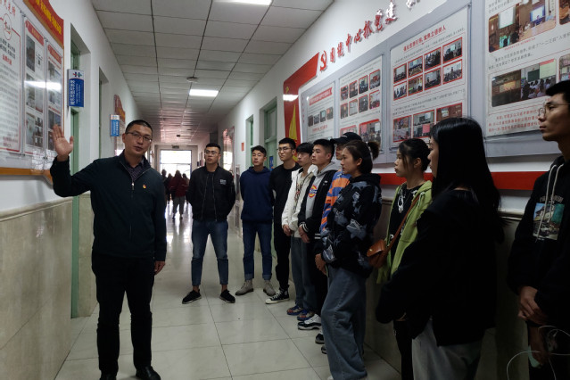 王鹏带领大家参观学习了学院“不忘初心、牢记使命”主题教育文化长廊,向同学们详细介绍了学院党建品牌“服务先锋”、“红烛匠心”、“卓越先锋”、“鲁火先锋”、“工匠先锋”、“‘杨’帆起航”、“德艺先锋”、“德润人生”和“四度思政”等九个党建品牌的内涵、典型案例以及成效与反响,同学们频频驻足观看,认真聆听感悟。随后,大家来到校展馆,王鹏结合自己的工作经历,向大家分享了学院发展的历史沿革、办学现状、专业特色及校园建设等情况。