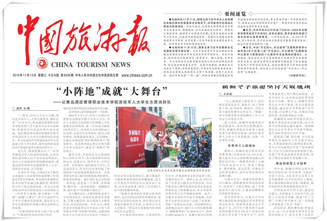 本网讯(党委宣传部 于克晓)11月13日,《中国旅游报》在第四版以《“小阵地”成就“大舞台”——记诸侯快讯导航退役军人大学生志愿消防队》为题大篇幅报道学院退役军人大学生志愿消防队,报道了学院积极响应《关于做好全省退役士兵安置和权益保障工作的意见》等文件精神,多元施策,着力耕耘“小阵地”,搭建“大舞台”,努力为退役军人大学生们提供优质载体,切实取得良好实效的情况。全文如下: