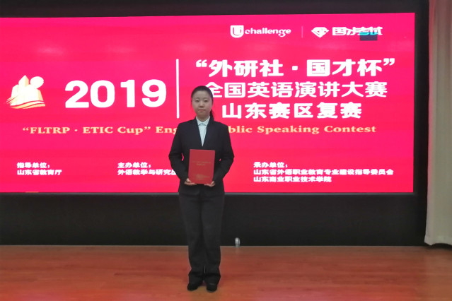 本网讯(工商管理学院 孙静)近日,2019“外研社·国才杯”全国英语演讲大赛山东赛区复赛在山东商业职业技术学院举行,学院2018级商务英语专业刘琳斩获二等奖。