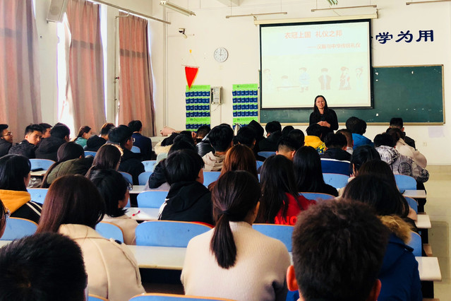 讲座以“衣冠上国,礼仪之邦”为主题,李云云从现在汉服风日益盛行的社会背景着手,分别向同学们介绍了汉族服饰的传统文化以及寓意,汉服穿衣风格与种类,汉服的样式以及现代服饰的演变历史与过程,以及见面礼、握手礼、学校礼仪和公共场所礼仪等礼仪规范。在体验环节,李云云向同学们现场演示了穿汉服的流程及技巧。