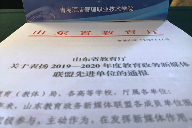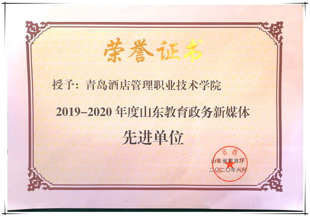 本网讯(宣传统战部 李代玉)6月19日-20日,2020年山东教育政务新媒体联盟年会在青岛召开,学院再获“2019-2020年度山东教育政务新媒体先进单位”称号,学院新媒体工作连续三年获省教育厅通报表扬。