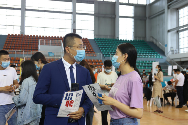 本网讯(招生就业办公室 张承业)6月23日,学院2020年实习就业校园现场招聘会在体育馆举办,学院为返校学生精准邀请了中国邮政集团公司、山东法尔消防科技有限公司、青岛特锐德电气股份有限公司、青岛大剧院、中联建业集团、青岛东方影都希尔顿酒店等34家企业单位,提供3000余个实习就业岗位。