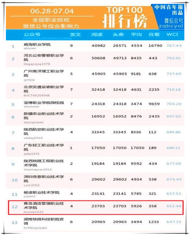 本网讯(宣传统战部 李代玉)7月6日,在中国青年报出品的《全国普通高校微信公号排行榜[6.28-7.4]》中,学院官方微信公众号“诸侯快讯导航(hismile1945)”综合影响力位列全国职业院校第十二位,四篇推文全部进入全国职业院校单周文章阅读量top100排行榜。
