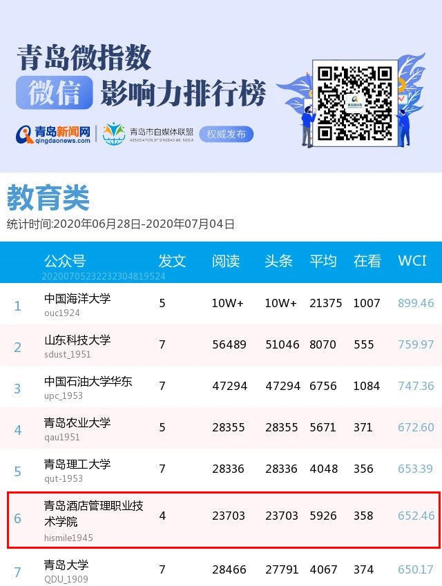 同时,在青岛新闻网的“青岛微指数微信影响力排行榜[6.28-7.4](教育类)”中,学院综合影响力位列第六位,排同类院校第一位。