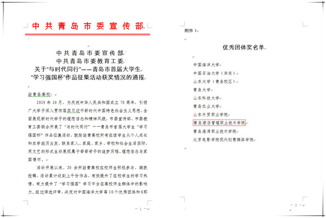 为庆祝中华人民共和国成立70周年,引领广大学子深入贯彻落实习近平新时代中国特色社会主义思想,全面展现新时代学子的理想信念和精神风貌,2019年10月,青岛市委宣传部、青岛市委教育工委联合开展了“与时代同行”——青岛市首届大学生“学习强国杯”作品征集活动,20余所驻青高校在校师生参与活动。经过校内选拔及校外评审,学院推荐的《向祖国敬礼》荣获短视频类二等奖,《退伍不褪色》《为爱行动,关爱智障儿童》荣获短视频类三等奖;《小城故事》《祖国海岸》荣获摄影类二等奖,《当归》《扬帆梦起》《渔舟唱晚》荣获摄影类三等奖;《赶火车的包袱》荣获文学类三等奖;《龙腾万里》《梦想从学习开始》荣获设计类三等奖。