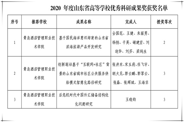 山东省高等学校优秀科研成果奖由山东省教育厅设立,旨在表彰奖励我省高等学校在科学研究方面做出贡献的教学、科研人员和单位,每年评奖、授奖一次。根据《关于推荐2020年度山东省高等学校优秀科研成果奖的通知》(鲁教科函〔2020〕19号)要求,经高校推荐、形式审查、专家评审、网上公示等环节,本年度高职高专院校共有自然科学类62项、人文社会科学类79项成果获奖。