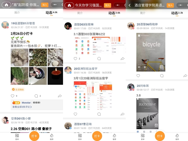 酒店管理学院引导全体学生参与两项活动,掀起一股“强国热”和“劳动潮”,鼓励学生随时随地都是课堂,时时处处都有施展舞台。超过3600人次的学生参与到“学习强国”学习挑战中,每日主动学习并上报分数截图进行“PK”;超过4000人次的学生参与到劳动教育中来,每日展示自己居家清扫卫生、做饭、洗碗等画面,帮助父母做一些力所能及的事,在劳动中感悟父母养育之恩。