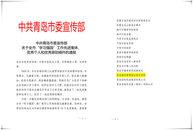 本网讯(党委宣传统战部 周晓莉)日前,中共青岛市委宣传部下发通报,对2020年在“学习强国”推广使用工作中取得优异成绩的先进集体和优秀个人进行通报表扬,学院被授予青岛市“学习强国”推广使用工作先进集体,也是青岛市唯一一所入选高校。