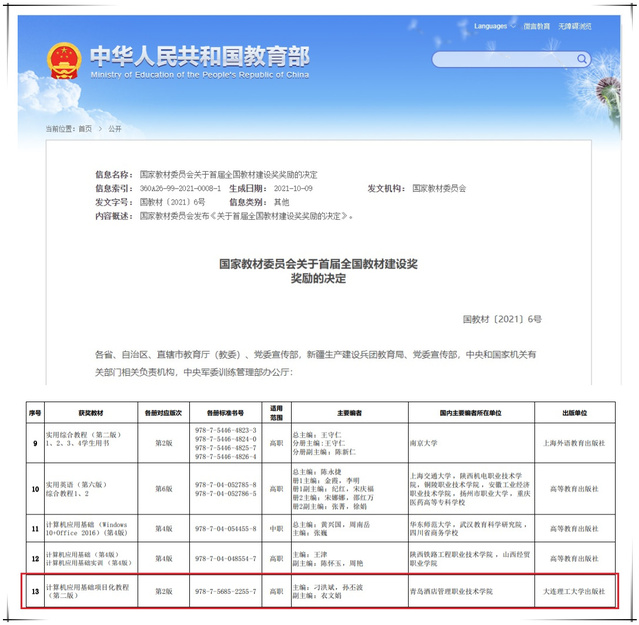全国教材建设奖是我国教材领域的最高奖项,是检阅、展示教材建设服务于党和国家人才培养所取得的成果,增强教材工作者荣誉感、责任感,推动构建中国特色、世界水平教材体系的一项重大制度。该奖项每4年评选一次,由国家教材委员会主办、教育部承办。学院此次获奖教材《计算机应用基础项目化教程(第二版)》(大连理工大学出版社出版)凝聚了编写组的智慧与心血,方向正确、科学严谨、适教利学,编校质量高、使用效果显著、社会影响好,最终获评二等奖。