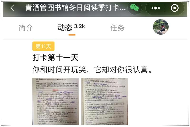 目前,图书馆“冬日阅读季打卡挑战赛”正在持续进行中,学生通过微信小程序参与活动,每天发布阅读内容,分享阅读感悟,通过互相激励、互相促进,让坚持阅读成为一种习惯和自觉。