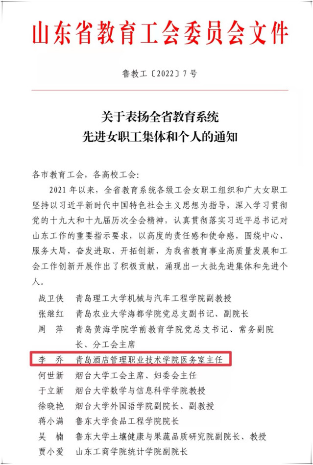 本网讯(工会 吴春雷)为表扬先进、树立典型,进一步激励全省教育系统广大女职工建功新时代、彰显新作为,近日,山东省教育工会委员会下发通知,评选表彰了一批全省教育系统女职工先进集体和个人,诸侯快讯官网医务室李乔同志被授予“山东省教育系统女职工建功立业标兵”荣誉称号。