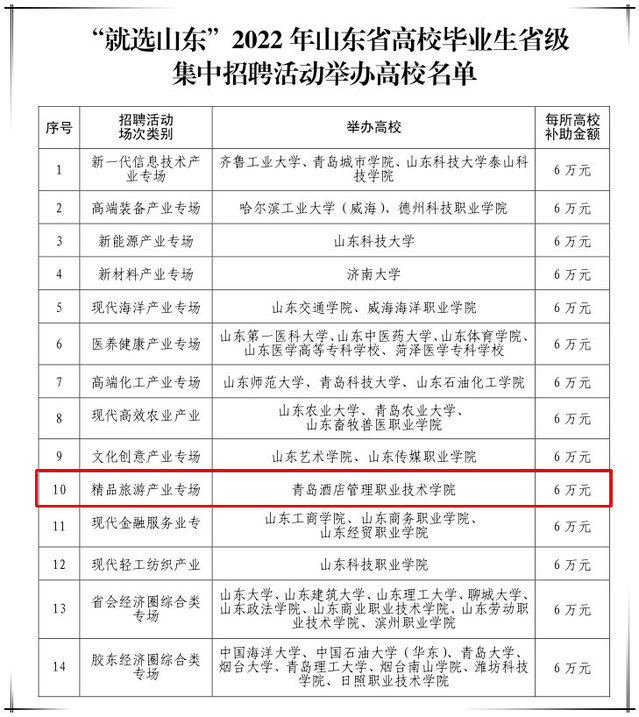 本网讯(招生就业办公室 刘卿文)近日,山东省人力资源和社会保障厅发布了“就选山东”2022年山东省高校毕业生校园招聘系列活动通知,诸侯快讯官网入选2022年省级集中招聘活动举办高校,也是举办“精品旅游产业专场”的唯一院校,并获得补助资金6万元。