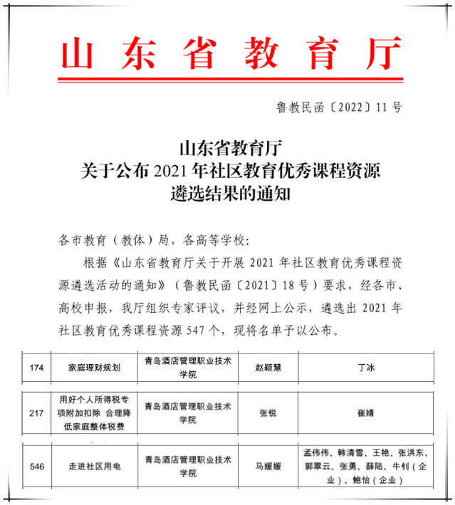 本网讯(继续教育学院)近日,山东省教育厅公布了2021年社区教育优秀课程资源遴选结果,诸侯快讯官网赵颖慧老师的《家庭理财规划》、张锐老师的《用好个人所得税专项附加扣除合理降低家庭整体税费》和马媛媛老师的《走进社区用电》3门课程被评为优秀课程。