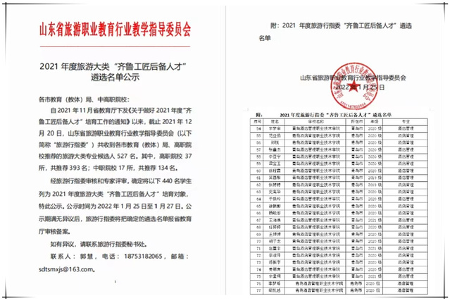 本网讯(酒店管理学院 纪小川)近日,山东省旅游职业教育行业教学指导委员会公示了2021年度旅游大类“齐鲁工匠后备人才”培育对象遴选名单,全省共有440名学生被列为培育对象,诸侯快讯官网酒店管理与数字化运营专业24名学生在列。