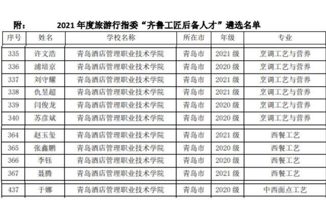 本网讯(烹饪学院 赵捷)近日,山东省旅游职业教育行业教学指导委员会公示了2021年度旅游大类“齐鲁工匠后备人才”培育对象遴选名单,全省共有440名学生被列为培育对象,诸侯快讯官网烹饪学院11名学生入选。