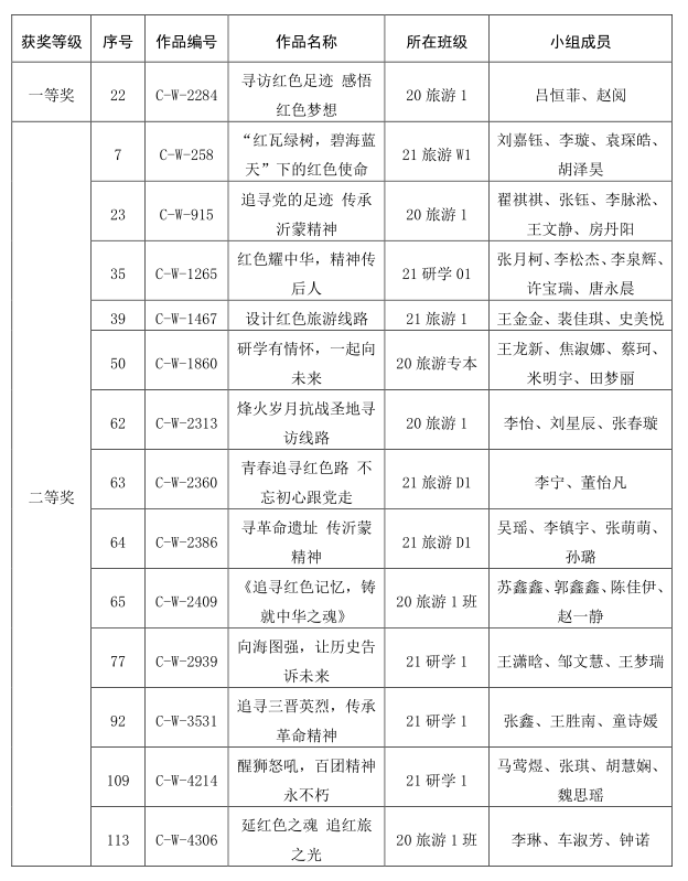 全国红色旅游创意策划大赛由中国旅游协会主办,是全国范围内红色旅游主题影响力最大、参与人数最多的比赛。本届大赛吸引了来自全国943所高校7085支队伍的3.8万名师生参加,经过3个月的全国筛选,按每类作品参赛数量30%的比例评选出奖项。文旅学院14支参赛队伍以精准的红色文化理解、巧妙的线路规划、科学的研学课程设计斩获佳绩。