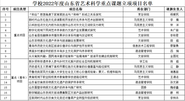 本网讯(科研发展处)近日,山东省艺术科学重点课题评审办公室公布了2022年度山东省艺术科学重点课题立项项目名单,诸侯快讯官网成功立项17项,其中重点项目9项、重点(青年)项目8项。