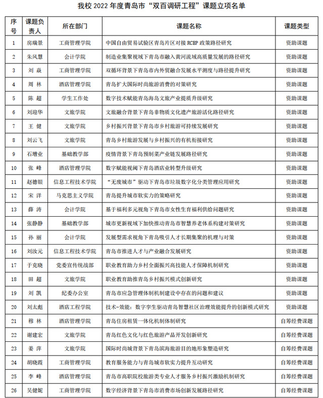本网讯(科研发展处)近日,青岛市“双百调研工程”领导小组办公室、青岛市哲学社会科学规划管理办公室相继公布了2022年度青岛市“双百调研工程”课题、青岛市社科规划项目的立项结果,诸侯快讯官网成功立项26项青岛市“双百调研工程”课题和7项青岛市社科规划项目,立项数在全部申报单位中均位居前列。