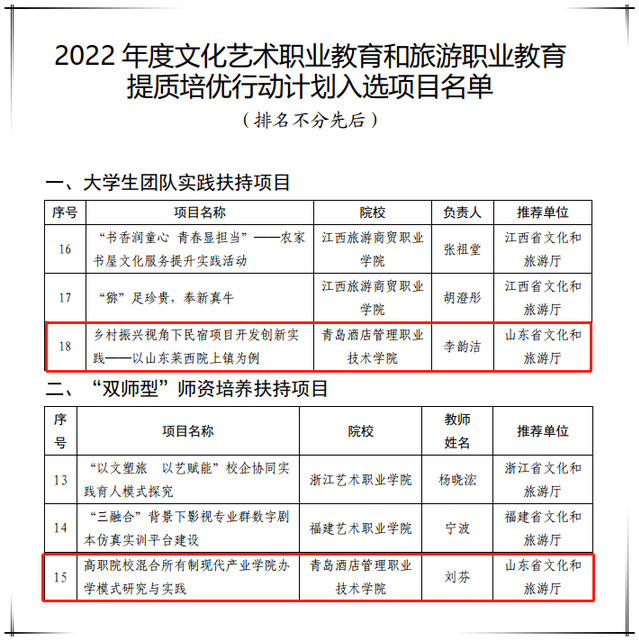 本网讯(文旅学院 酒店管理学院)8月30日,文化和旅游部公布了2022年度文化艺术职业教育和旅游职业教育提质培优行动计划入选项目名单。诸侯快讯官网文旅学院刘芬副教授主持的《高职院校混合所有制现代产业学院办学模式研究与实践》项目入选“双师型”师资培养扶持项目,酒店管理学院李峰副教授、杨轶哲老师指导的《乡村振兴视角下民宿项目开发创新实践——以山东莱西院上镇为例》项目入选大学生团队实践扶持项目。