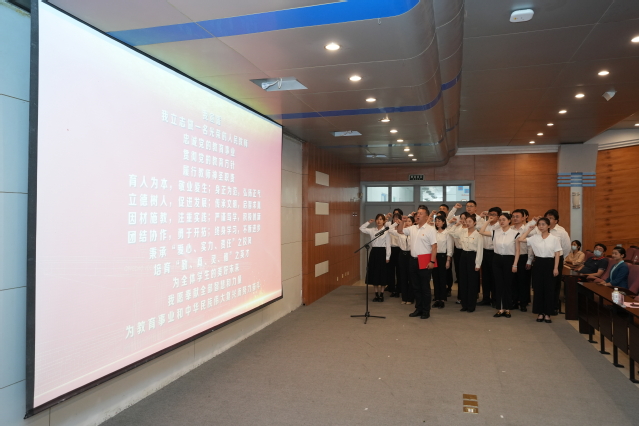 会上,举行了新教师入职宣誓仪式。在山东省技术能手、学校首届教学名师、烹饪学院副院长王志兴的领誓下,全体新入职教师庄严宣誓。