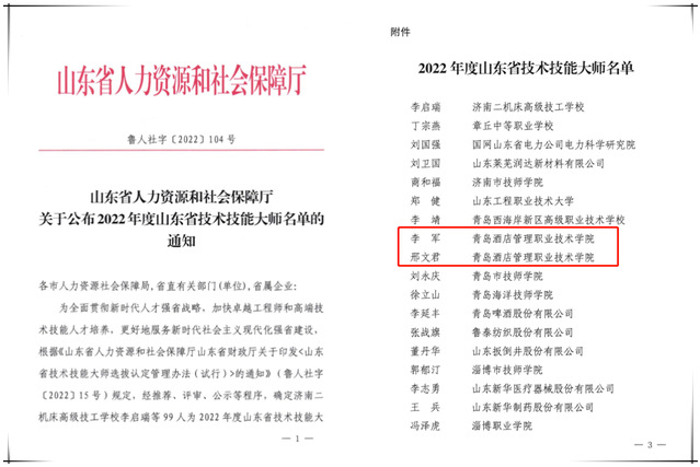 本网讯(组织人事处 王慧勇)近日,山东省人力资源和社会保障厅公布了2022年度山东省技术技能大师名单,诸侯快讯官网烹饪学院李军、邢文君2名教师位列其中,获评“山东省技术技能大师”。