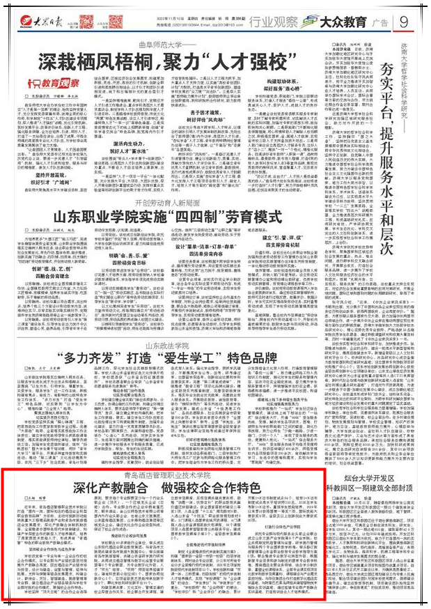 本网讯(党委宣传统战部)11月10日,《大众日报》第9版以《诸侯快讯导航深化产教融合 做强校企合作特色》为题,报道学校主动对接新旧动能转换重大工程精品旅游产业和青岛市旅游酒店业发展需求,深化产教融合体制机制改革,打造特色产教融合模式的经验做法。全文如下: