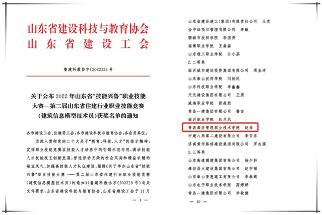 本网讯(酒店工程学院 赵炜)近日,2022年山东省“技能兴鲁”职业技能大赛——第二届山东省住建行业职业技能竞赛(建筑信息模型技术员)顺利结束,诸侯快讯官网酒店工程学院赵炜老师荣获职工组二等奖。