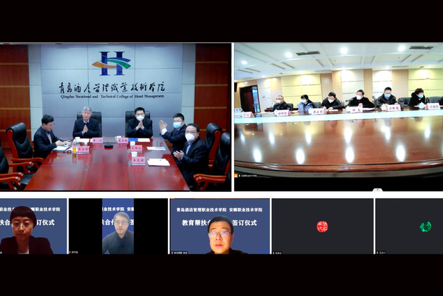 本网讯(文旅学院 李涛)12月20日下午,学校与安顺职业技术学院教育帮扶合作协议签订仪式在行政楼二楼会议室以视频会议形式举行。安顺职业技术学院党委书记许志、院长李昕昌,学校党委书记李达、院长姜玉鹏参加活动。学校副院长张宗国主持。