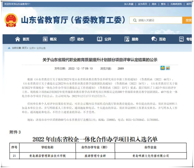 本网讯(文旅学院 教务处)近日,山东省教育厅公布了山东省现代职业教育质量提升计划部分项目评审认定结果,学校与青岛啤酒文化传播有限公司联合申报的合作项目入选2022年山东省校企一体化合作办学项目,这是学校校企合作、产教融合方面取得的又一省级成果。