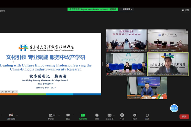 本网讯(国际交流与合作处 张晴)1月6日下午,由山东省人民政府外事办公室、中非职业教育联盟主办的中国(山东)-埃塞俄比亚职业教育合作对话会在线举行。山东省人民政府外事办公室副主任李永森、埃塞俄比亚劳工部国务部长Dr. Teshale、学校党委副书记韩西清参加会议。