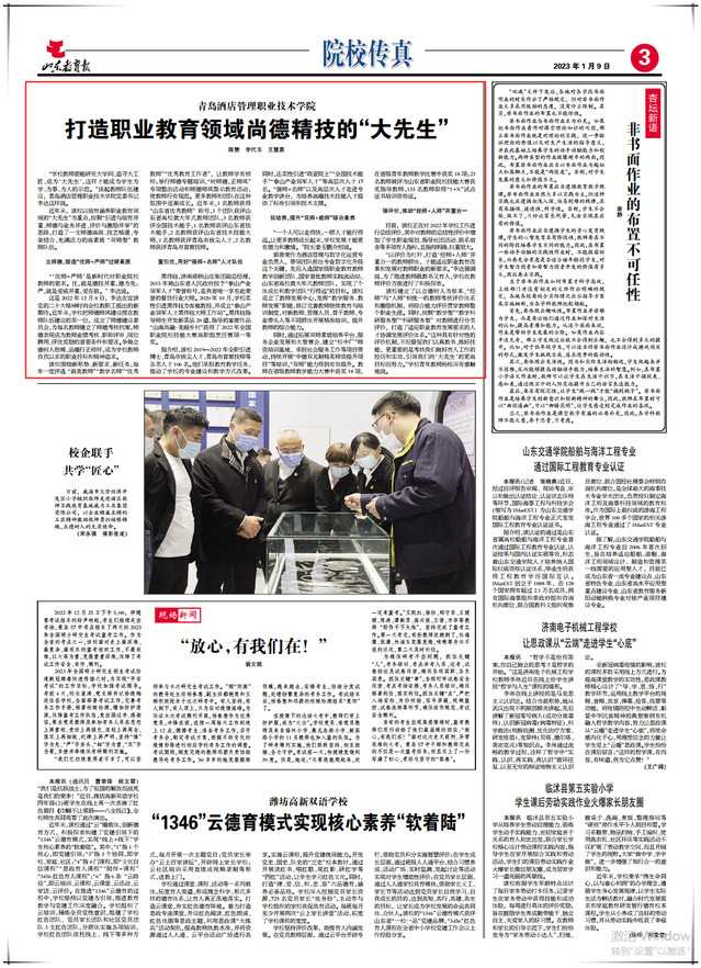 本网讯(党委宣传统战部)1月9日,《山东教育报》第3版以《诸侯快讯导航打造职业教育领域尚德精技的“大先生”》为题,报道学校以培育涵养职业教育领域的“大先生”为重点,按照“引进与培育并重、师德与业务并进、评价与激励并举”的思路,打造师德高尚、技艺精湛、专兼结合、充满活力的高素质“双师型”教师队伍的经验做法。全文如下: