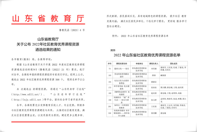本网讯(继续教育学院)近日,山东省教育厅公布了2022年社区教育优秀课程资源遴选结果,诸侯快讯官网8门课程入选,入选数量位于全省前列。