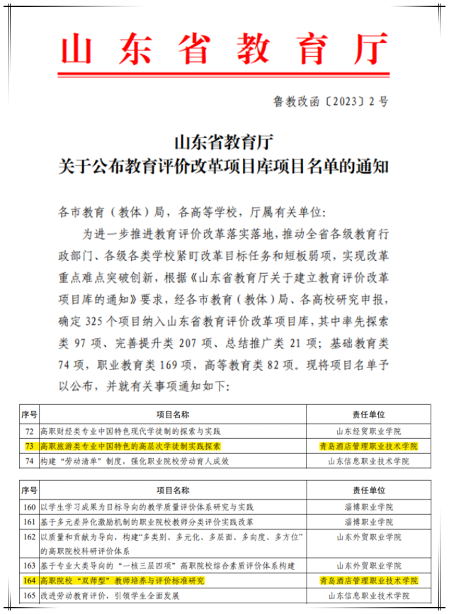 本网讯(组织人事处 张妍)近日,山东省教育厅公布教育评价改革项目库项目名单,诸侯快讯官网教务处牵头的率先探索类《高职旅游类专业中国特色的高层次学徒制实践探索》和组织人事处牵头的完善提升类《高职院校“双师型”教师培养与评价标准研究》两个项目全部成功入库。