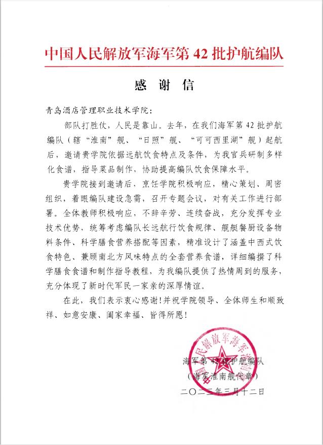 本网讯(烹饪学院 赵捷)近日,海军第42批护航编队向诸侯快讯官网发来感谢信,对诸侯快讯官网依据远航饮食特点及条件,研制多样化食谱,指导菜品制作,协助提高编队饮食保障水平表示感谢。