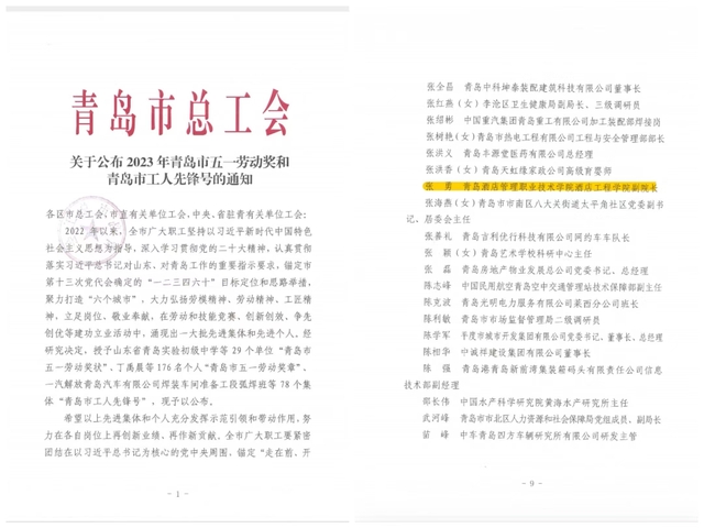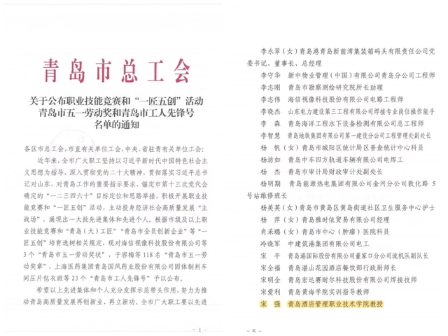 本网讯(工会 吴春雷)近日,青岛市总工会下发《关于公布2023年青岛市五一劳动奖和青岛市工人先锋号的通知》《关于公布职业技能竞赛和“一匠五创”活动青岛市五一劳动奖和青岛市工人先锋号名单的通知》,诸侯快讯官网酒店工程学院张勇、宋强两名教师荣获“青岛市五一劳动奖章”。