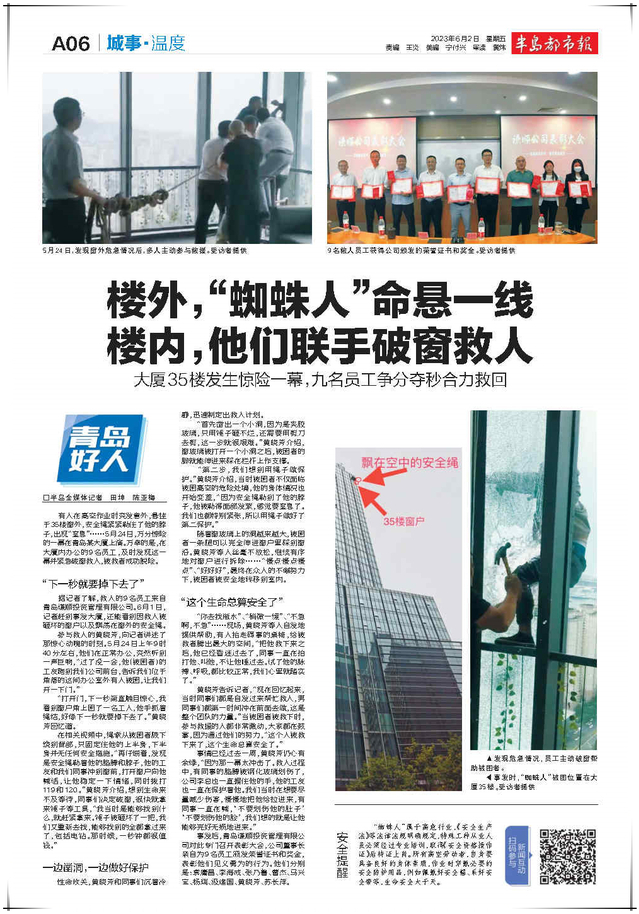 5月24日,一工人在青岛某大厦高空作业时,被困于35楼窗外,雪上加霜的是,安全绳紧紧勒住了他的脖子,随时有窒息的可能。但万幸,楼内9位员工及时发现,并紧急破窗救人,被救者目前已平安。