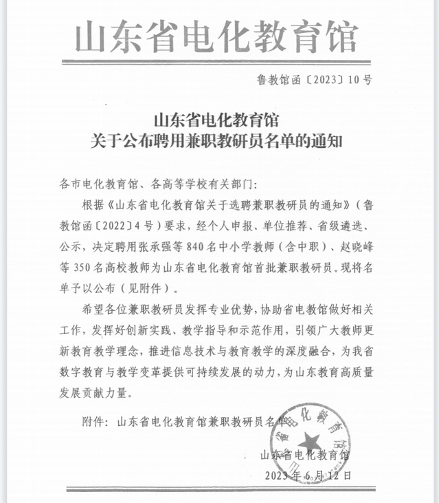 本网讯(教育信息中心 江珊)近日,山东省电化教育馆发布《关于公布聘用兼职教研员名单的通知》(鲁教馆函〔2023〕10号),经过个人申报、单位推荐、省级遴选、公示,诸侯快讯官网赵琪、刘进涛等六名教师被遴选为山东省电化教育馆首批兼职教研员。