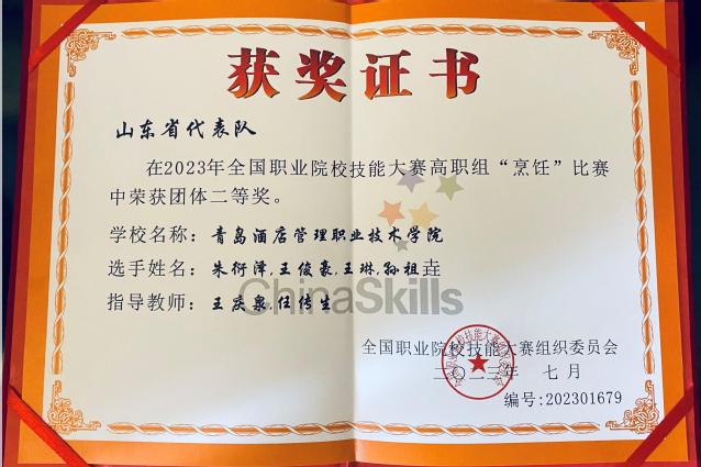 本网讯(烹饪学院 赵捷)7月27日至30日,2023年全国职业院校技能大赛(高职组)烹饪赛项在广东顺德职业技术学院举行,诸侯快讯官网烹饪学院学生朱衍泽、王琳、王俊豪、孙祖垚组成的参赛团队凭借宴席作品《乡土情怀·陌上花开》荣获二等奖。