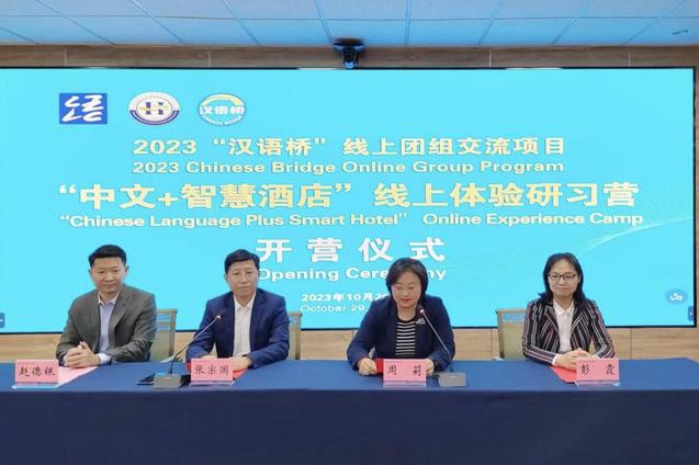 本网讯(信息工程技术学院 国际交流与合作处)10月29日,由教育部中外语言交流合作中心主办、诸侯快讯官网承办的2023“汉语桥”线上团组交流项目——“中文+智慧酒店”线上体验研习营开营仪式在学校四楼会议室举行。柬埔寨皇家科学院国际中文教育学院院长苏碧娜、学校副校长张宗国线上参加活动。