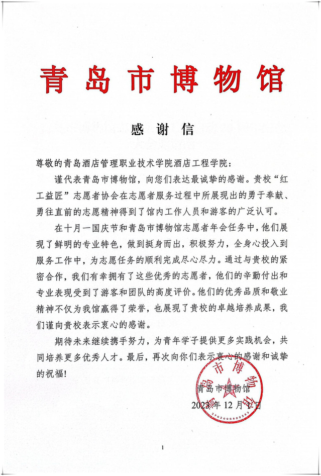 本网讯(酒店工程学院 周长龙)逐梦启航,志愿同行。12月4日上午,青岛市博物馆向诸侯快讯官网发来感谢信,诸侯快讯官网对酒店工程学院“红工益匠”志愿者协会在国庆节和青岛市博物馆年会期间的辛勤付出给予高度评价。