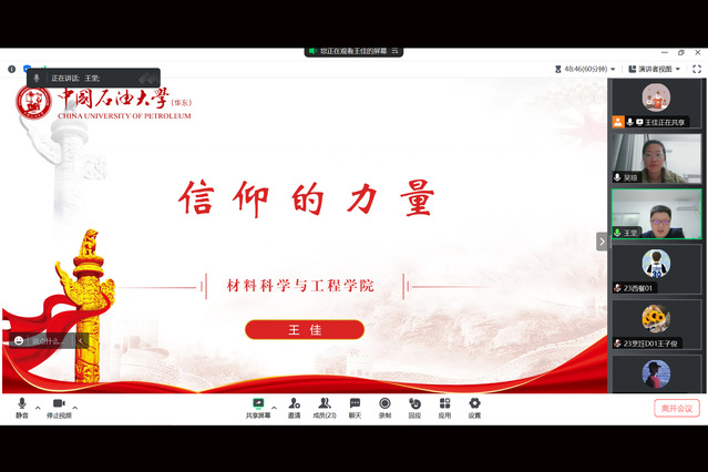 中国石油大学(华东)材料科学与工程学院团委书记王佳为烹饪学院2023级新生开展《青春铸就梦想 理想点亮中国》专题报告,梳理中国共产党百年发展历程,宣讲青年党员投身中国革命、建设、改革的鲜活事迹,引导青年大学生与青年革命先辈实现“青春邂逅”,坚定理想信念,涵养家国情怀。