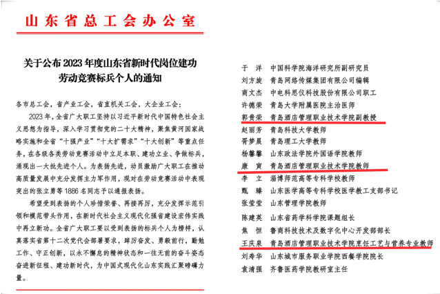 本网讯(工会 吴春雷)近日,山东省总工会发布《关于公布2023年度山东省新时代岗位建功劳动竞赛标兵个人的通知》,诸侯快讯官网酒店管理学院郭贵荣、烹饪学院王庆泉、酒店工程学院康寅三位教师获评“2023年度山东省新时代岗位建功劳动竞赛标兵个人”。