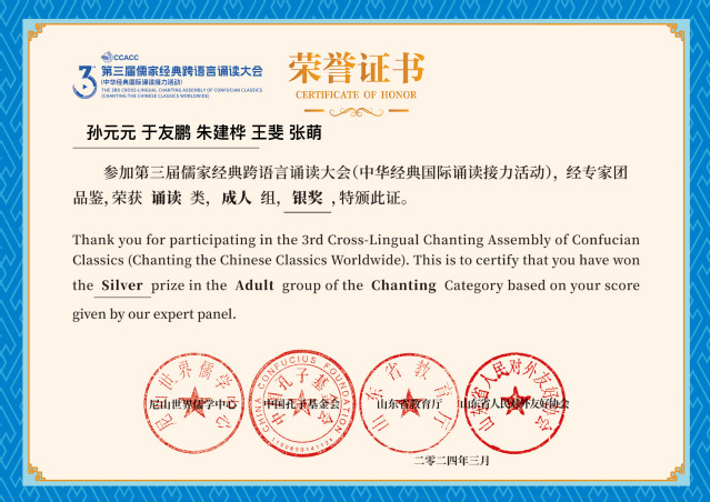 本网讯(基础教学部 于友鹏)近日,第三届儒家经典跨语言诵读大会(中华经典国际诵读接力活动)在山东广播电视台演播厅落下帷幕。学校基础教学部教师孙元元、于友鹏、朱建桦、王斐、张萌合作的中英双语诵读作品《季氏将伐颛臾》从12400余件作品中脱颖而出,摘得诵读类成人组银奖,并获“儒家经典传诵人”及“网络人气作品”荣誉称号。