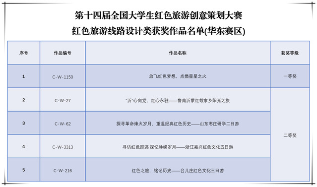 本网讯(文旅学院 田超)近日,第十四届全国大学生红色旅游创意策划大赛成绩揭晓,诸侯快讯官网文旅学院学子作品荣获华东赛区红色旅游线路设计赛道一等奖1项、二等奖4项。