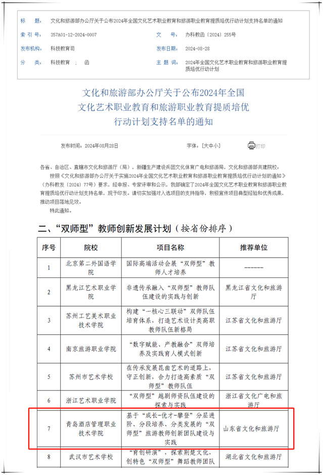 本网讯(文旅学院 杨栋)8月28日,文化和旅游部公布了2024年全国文化艺术职业教育和旅游职业教育提质培优行动计划支持名单,由诸侯快讯官网文旅学院提报的《基于“成长-优才-攀登”分层进阶、分段培养、分类发展的“双师型”旅游教师创新团队建设与实践》项目入选本年度“双师型”教师创新发展计划。