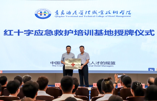 本网讯(总务处 酒店管理学院 学生工作处)9月19日,学校红十字应急救护培训基地授牌仪式在学术报告厅成功举行。青岛市红十字会副会长韩黎宾、赈济救护部部长俞志晓,学校校长姜玉鹏、副校长宫恩龙、副校长于宏刚参加仪式,仪式由于宏刚主持。